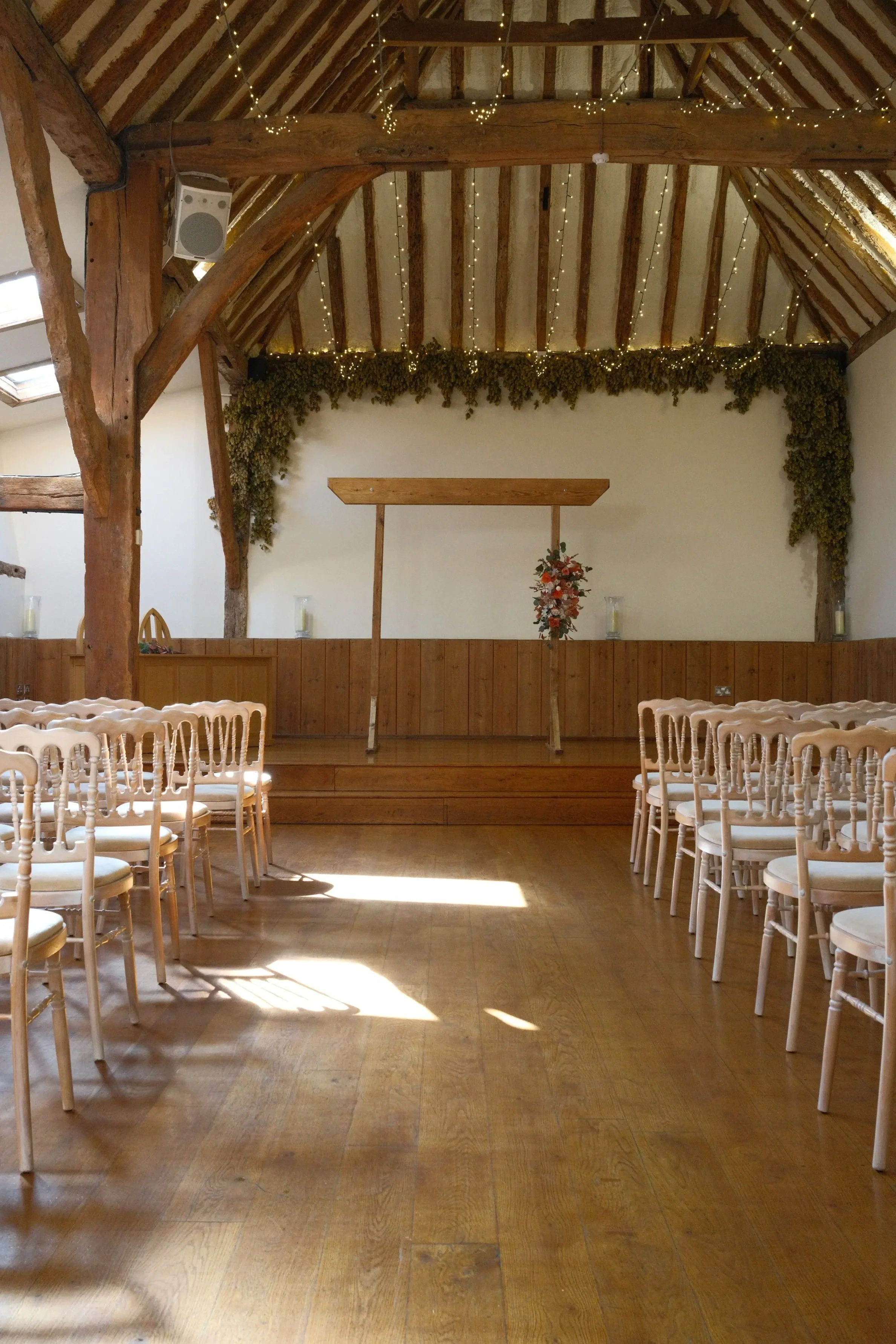 Outside the charming courtyard and gardens provide delightful entertaining spaces. The colourful flowers, stunning views, and the chance to hold your ceremony under our wedding arch, make summer weddings something special. If the temperatures outside aren’t so pleasant, the welcoming atmosphere inside our barns can warm even the coldest winter.